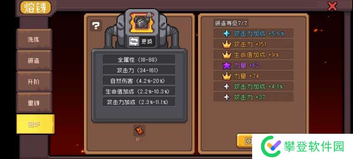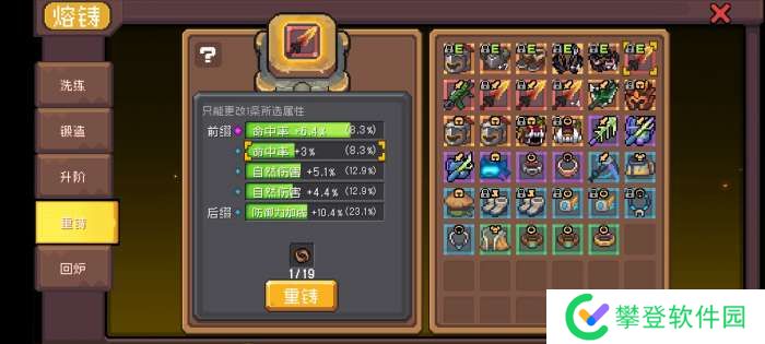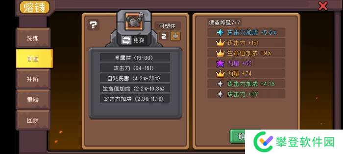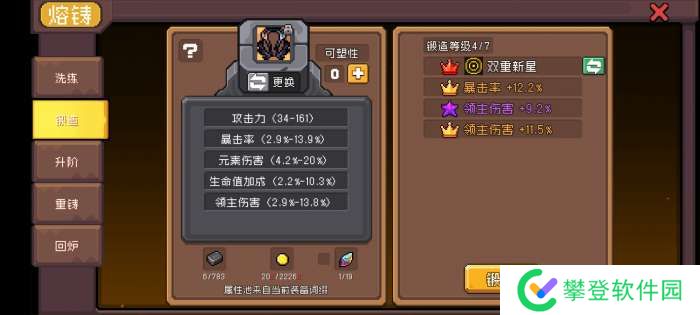 ②、在锻造功能处可以打造新的词条,打造出的词条类型取决于上述前缀和后缀词条,简单来说就是装备掉落的时候他有啥词条就能锻出啥词条,至于数值就是随机,看脸。特殊的是在锻造时可能出现红色王冠词条,这是一个羁绊词条,锻造出来就相当于多一个羁绊,可以花费火山石更换,同时也会消耗可塑性。