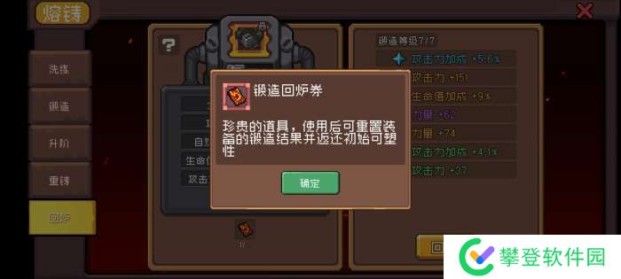 消耗锻造回炉券将已锻造的装备退回未锻造状态,同时恢复初始可塑性,智能恢复初始的,用券增加的不行。