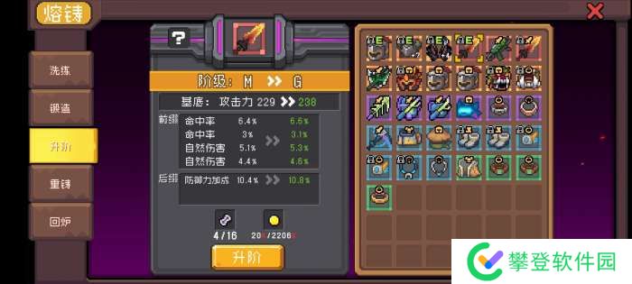 消耗磨砺石升级装备阶数,同时提升基础词条数值。