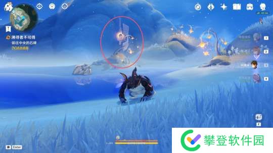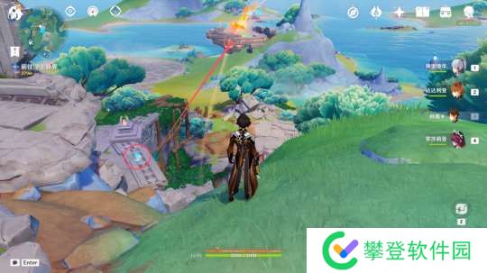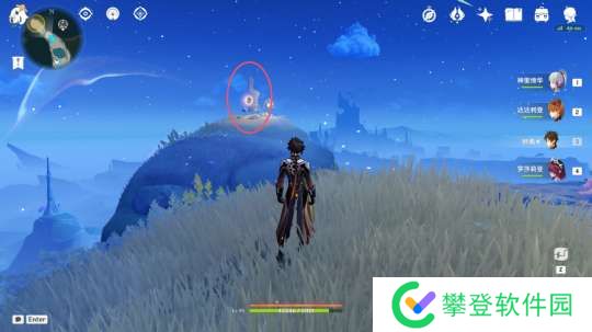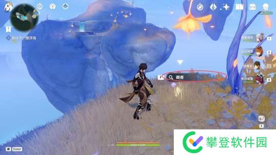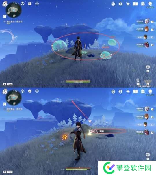高点位置,击败此处的风史莱姆,出现发光点进行调查,再击打出现的风琥珀出现风场,通过风场到达另一处浮岛解锁传送锚点。