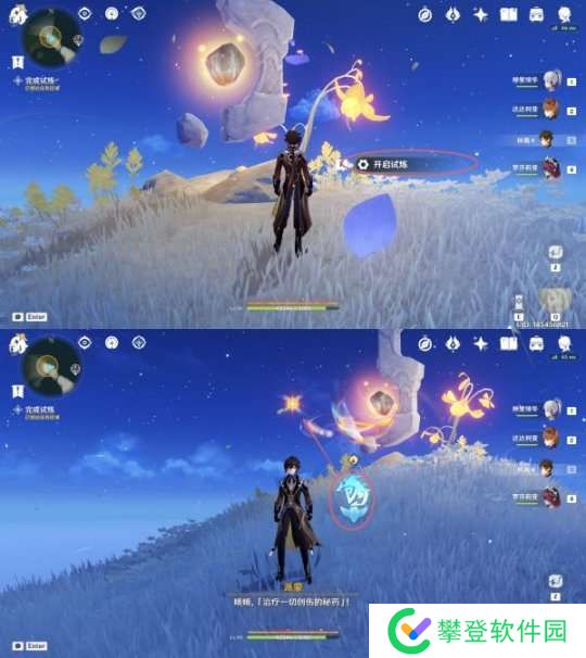 开启试炼,魂附鳍游龙搭上游隙灵道,途中需要我们跟随发光球→拾取「游光球」,以及左右跳跃切换灵道即可,最终会降落在浮土静界的中心,并且在即将到达的途中获得成就「前有隐藏…」。