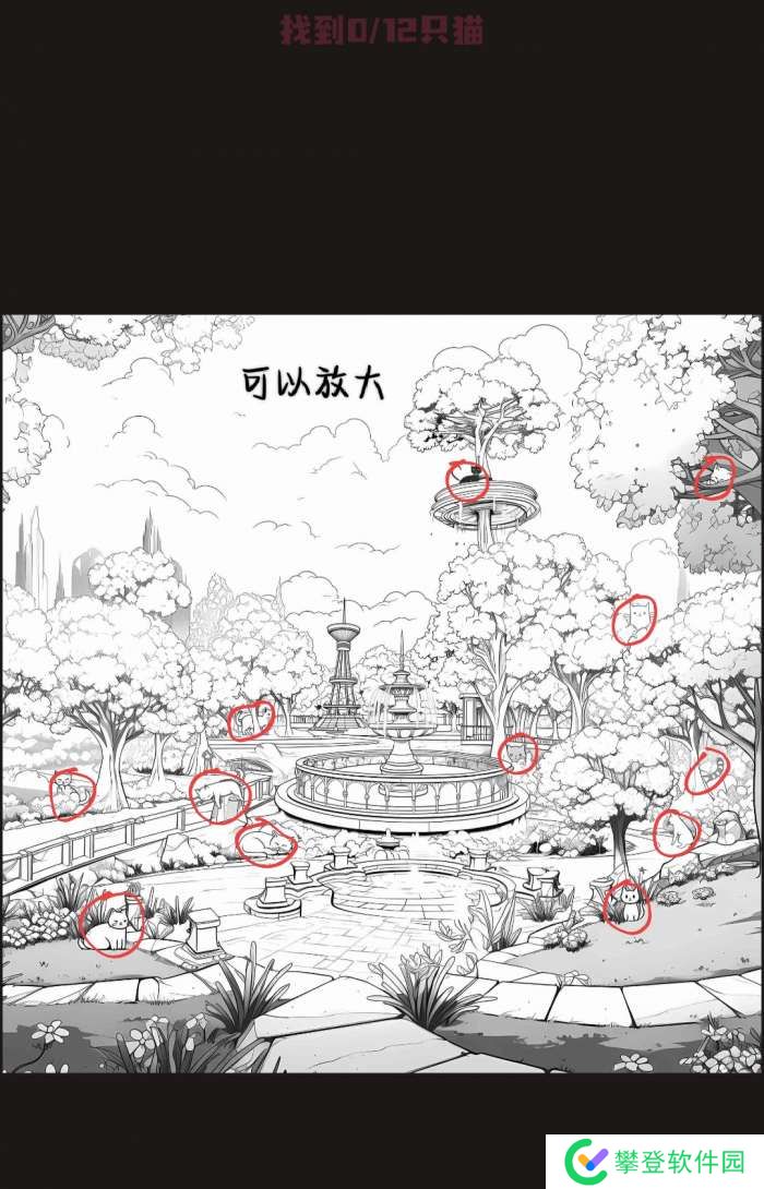 这一关需要在黑白图中找到12只猫,具体位置如下: