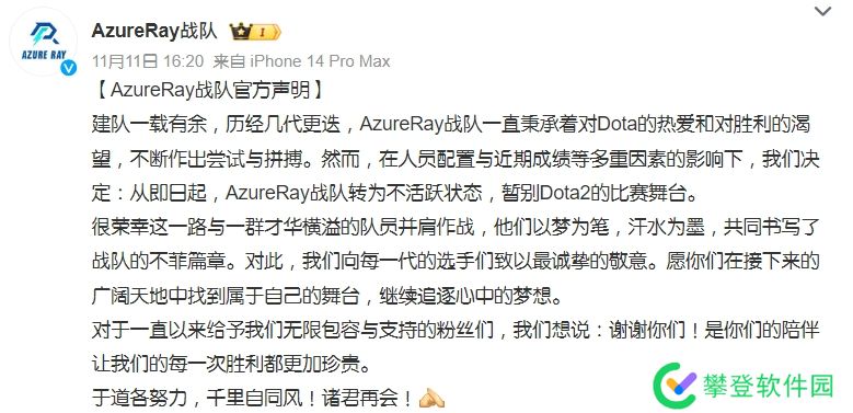近日,AzureRay战队官方微博发布一条消息,宣布战队进入不活跃状态,暂别Dota2的比赛舞台。原文如下: