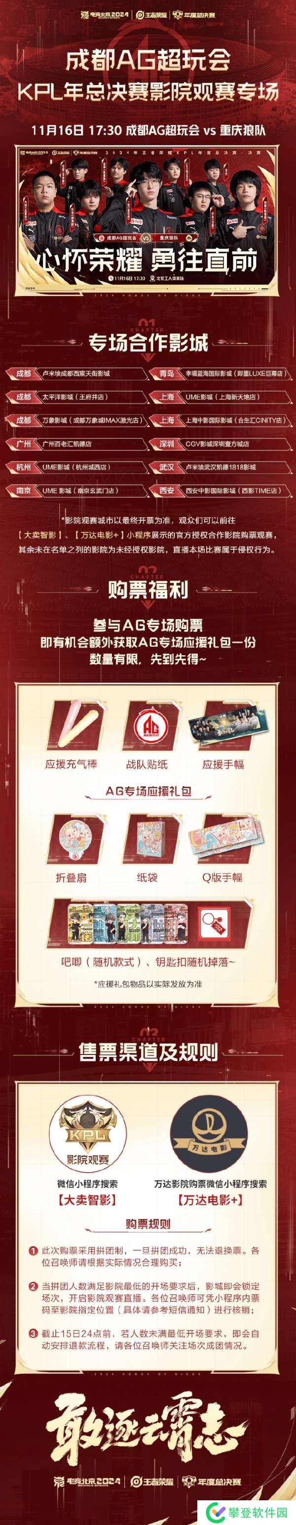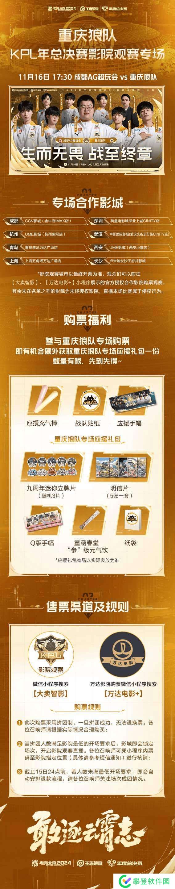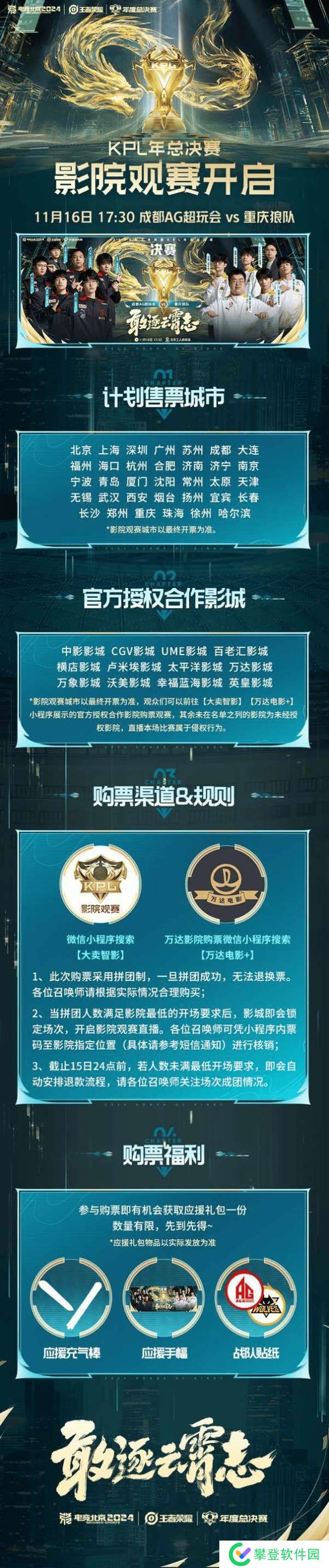 计划在全国34座城市开设KPL年总决赛影院观赛直播,购票观众可以领取一份应援礼包,数量有限先到先得;