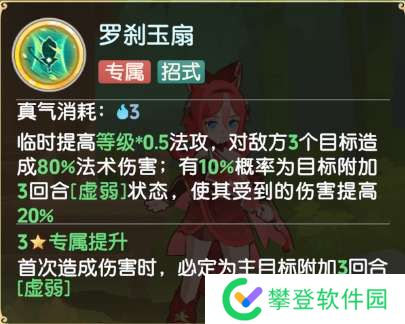 离火之境在65级一共有3只契灵,其中玉扇狸是其中之一,非常高的气血资质,加上定位是法功契灵,专属招式还带虚弱,五星强化后,虚弱几率为16.25%,使虚弱目标受到伤害提高20%。在攻略一些抗性较高的boss时,有很好的效果,PVP中可玩性也很强。接下来给大家带来了《离火之境》玉扇狸强度PVE/PVP技能推荐!