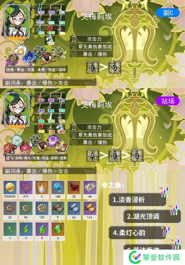 这个是满命玩法,跟上面一样的,只是艾梅莉埃的普攻附魔成草的而已,但是自己附魔的草还有增伤,且无法被覆盖,所以只能是自己的普攻打草伤了,当做一般的站场草C那样去玩就好了。基本上每次附魔只能打两轮附魔普攻。