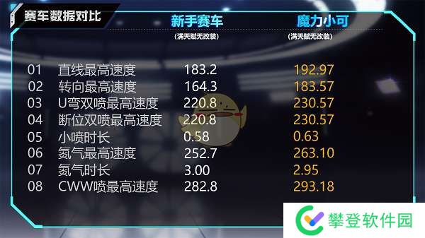 从六维性能图来看,魔力小可各项属性均良好,基础属性中集气和转向方面较优,搭配实用的赛车特性,适合新手赛车手驾驶。