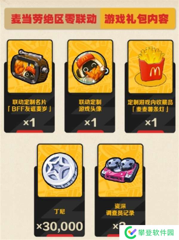 联动周边套组x1份、定制邦布包装盒x1个、麦当劳绝区零联动游戏礼包兑换码x1个