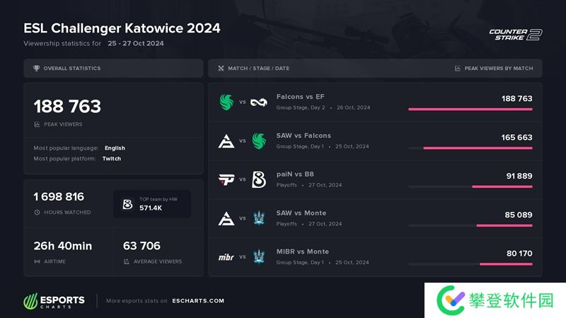 而外媒EsportsCharts也在近日统计了ESL 挑战者 卡托维兹2024的峰值观赛数据: