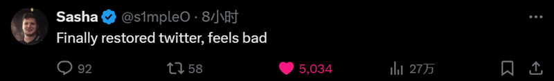Falcons战队选手s1mple在推特发布动态,表示自己终于恢复了推特账号。