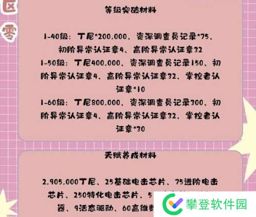 1-60级:丁尼800,000、资深调查员记录300、初阶异常认证章4、高阶异常认证章32、掌控者认证章*30。