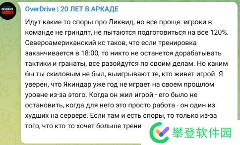 “关于外界一些对Liquid战队的争论,其实很简单:选手们都没有刻苦训练,不会试图投入120%的精力。北美CS的氛围就是这样,如果当日的训练在18:00结束,那不会有人留下来继续研究战术或投掷物,大家都会去忙自己的事情。但是,无论你水平有多强,只有那些全身心投入游戏的人会获得胜利。我敢肯定的是,YEKINDAR一年多时间没有发挥出他曾经的水平就是这个原因。当他全身心投入游戏中时,他是不可阻挡的,而当CS对他来说只是一份工作时,他就变成了比赛中表现最差的选手之一。如果队里真的有争论点,那只能是因为有人想多训练,而有些人不想。”