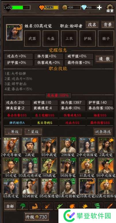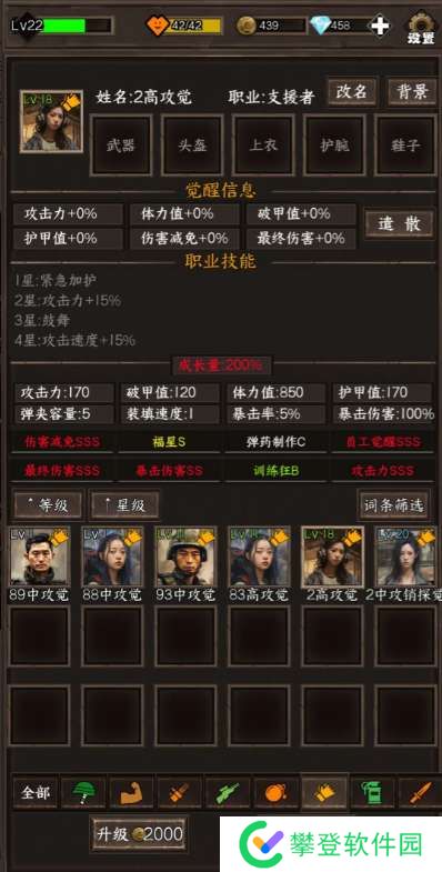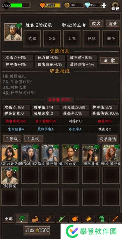 主要词条:伤害减免 员工觉醒(如果2个都是3S成长量在高点的话,有没有攻击词条都行,因为伤害太低了,而且攻击范围1)