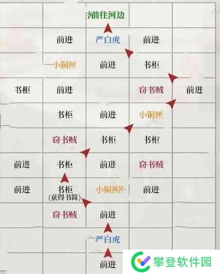2、藏书阁:前进-严白虎-前进-书柜*3-小铜匣-前进-书柜