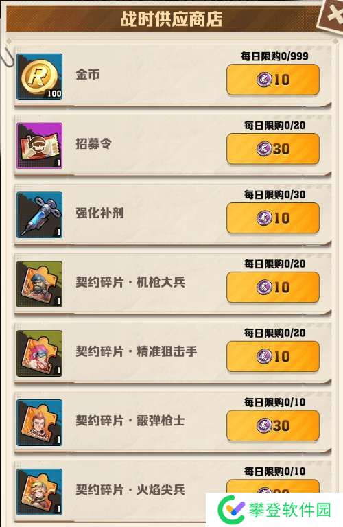 战时供应商店中优先兑换:换超时空军团碎片(每天五张)、金币、强化补剂,有剩余的才换招募令。