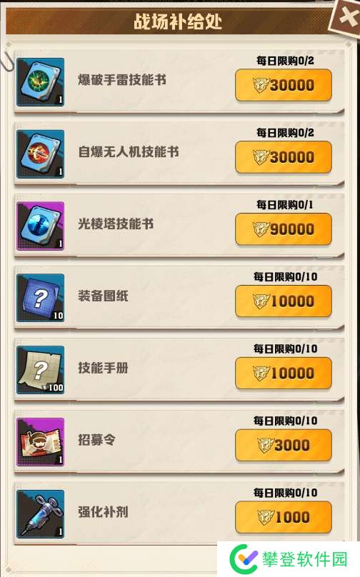 战场争霸商店中优先兑换:金币、枪械图纸,强化补剂、对于的换招募令、技能手册。在刚解锁战场争霸的时候,优先换最前面的三个技能书,光棱塔还是挺好用(它可以挡住开垦者首领的攻击,当它举起钻头的时候就点光棱塔,这个一定要换取)另外两个解锁了就行,不要着急升级它们!