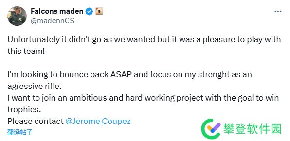 Falcons在未能晋级上海Major后下放了队内选手Maden、Snappi、dupreeh三人。近期,Maden发表了一篇文章用以求职,寻找一个“雄心勃勃”的队伍。
