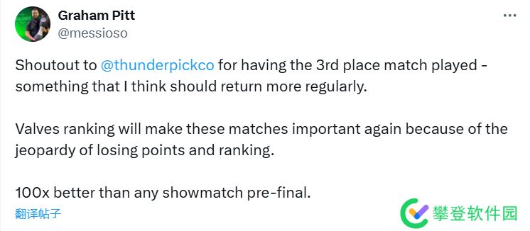 messioso:“为季军赛的举行欢呼——我觉得这应该更多地举行。Valve所颁发的排名让这种比赛变得更加重要,因为失去积分和排名会带来危险。这比任何决赛前的表演赛都要好上100倍。”