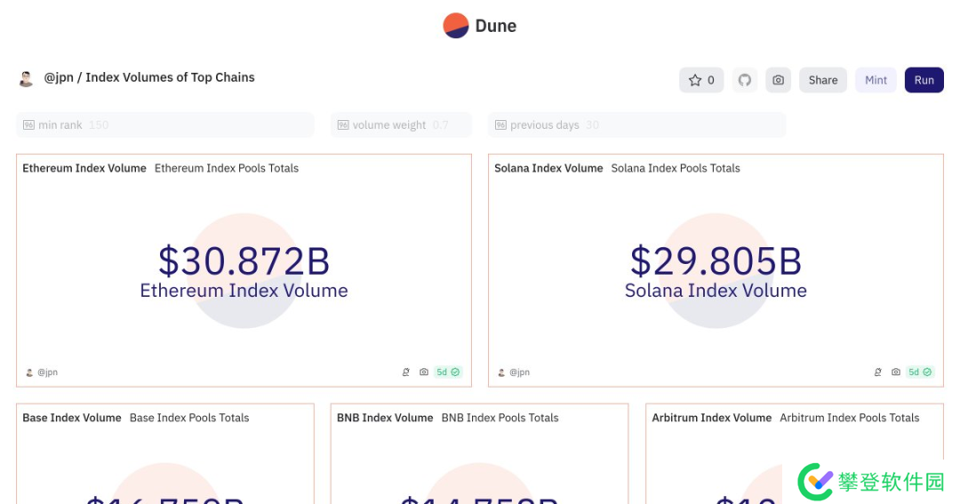 我收集了 Ethereum、Solana、BSC、@arbitrum 和 @base 上所有流动性池的交易量数据,并统计了过去 30 天的总交易量。