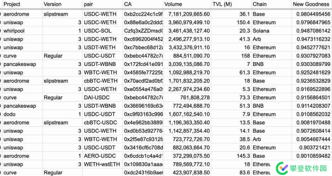 Ethereum:10Base:5Arbitrum:2BSC:2Solana:1在本次分析中,其他所有的 Solana 池都因为 TVL ( 总锁仓量 ) 不足而无法进入前列。尽管交易量很大,但这些交易发生在流动性显著低于其他链的情况下。