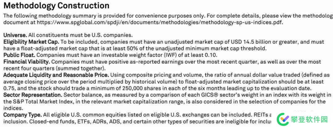 适用范围: 所有成分股必须是美国公司。市值资格: 要被纳入,公司必须拥有至少 145 亿美元的未经调整的市值,并且其流通调整市值必须至少达到未经调整最低市值门槛的 50%。公众持股: 公司必须拥有至少 0.10 的可投资权重因子(IWF)。财务可行性: 公司在最近一个季度以及最近四个季度(总和)中必须有正收益。充足的流动性和合理的价格: 使用综合定价和交易量,年度交易额(定义为期间的平均收盘价乘以历史交易量)与流通调整市值的比率应至少为 0.75,并且股票在评估日期前的六个月内每月交易量应至少为 250,000 股。行业代表性: 行业代表性通过比较每个 GICS®行业在指数中的权重与其在 S&P 总市场指数中的权重进行衡量,并在相关市值范围内考虑公司选择。公司类型: 所有在合格美国交易所上市的合格美国普通股均可被纳入。房地产投资信托基金(REITs)也有资格被纳入。封闭式基金、ETF、ADR、ADS 及某些其他类型的证券则没有资格被纳入。
