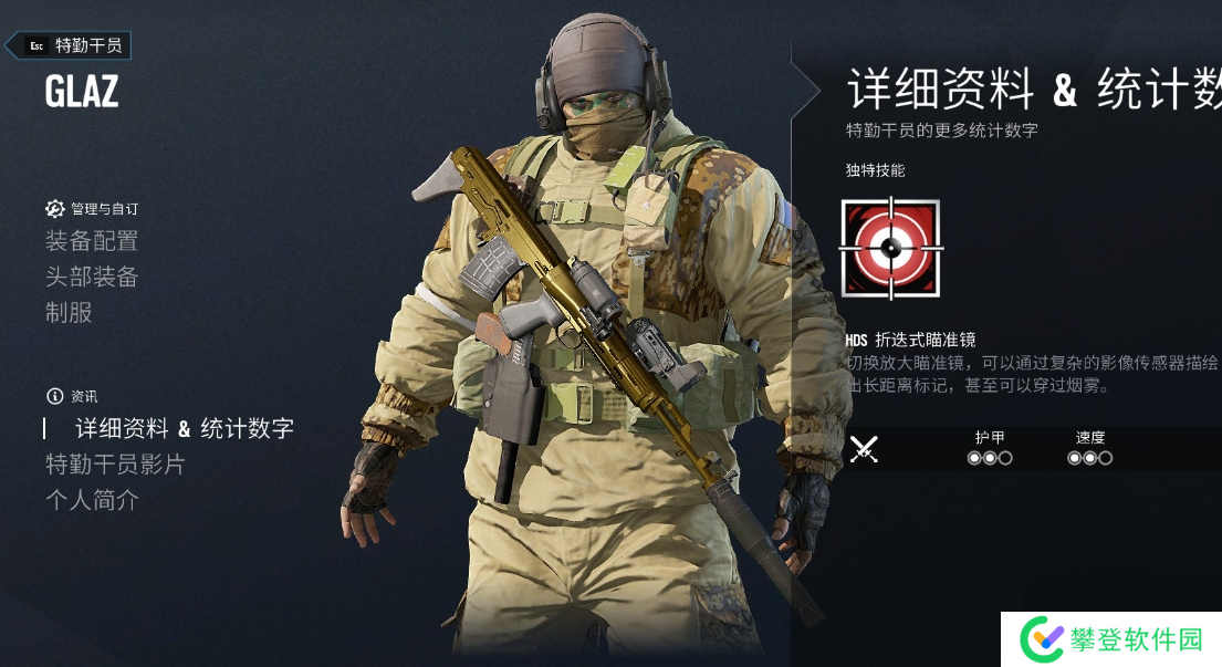 不管是什么样的FPS类游戏,狙击手这个位置一定都是非常强大而且神秘的,**于千里之外,一招毙命。Glaz在彩虹六号中的定位就是一名标准的狙击手,威力极大,也是整个游戏里唯一一个可以不用跟队突进就对防守...