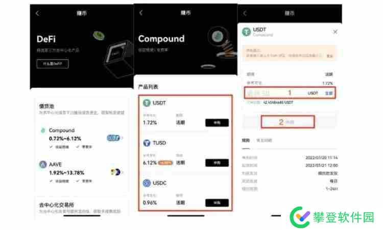 3、选择你要参与的产品,以【Compound】为例 — 选择USDT【申购】;输入【申购数量】 — 【申购】,按要求完成操作