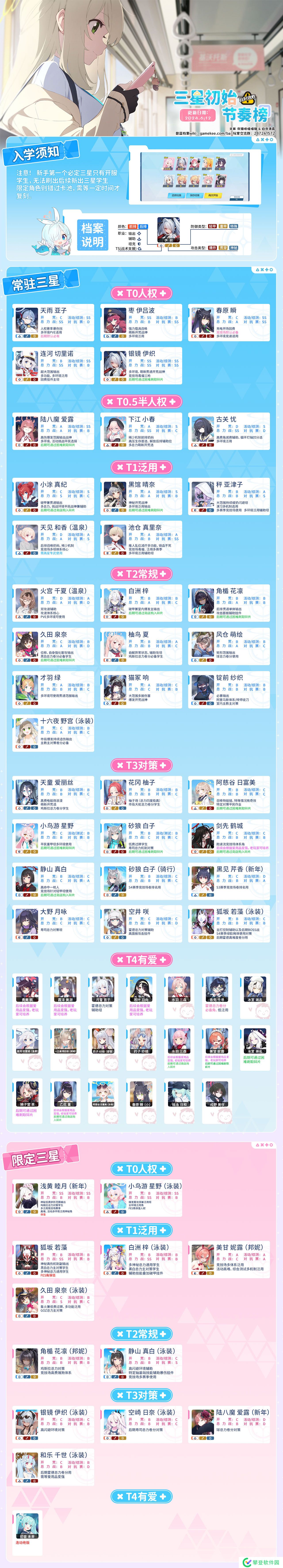 今日带来的事碧蓝档案国服(国服正式名为“蔚蓝档案”)三星初始、节奏榜,涵盖范围为新手开荒、总力战、活动高难/综合测试、对抗赛S3赛季,请根据自身玩法以及需求选择喜欢的学生!
