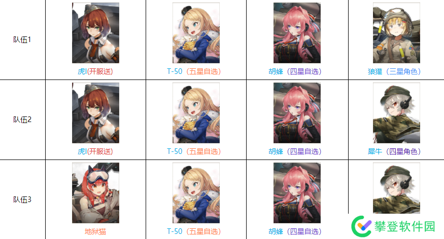 队伍1:虎I(开服送)、T-50(五星自选)、胡蜂(四星自选)、狼獾(三星角色)