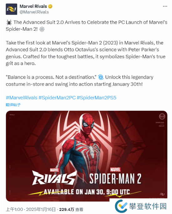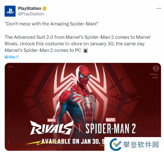 PS和《漫威争锋》官方推特共同宣布了这一消息,预计这款全新外观将于1月30日加入《漫威争锋》,值得一提的是,当天也是《漫威蜘蛛侠2》登陆PC平台的日子。