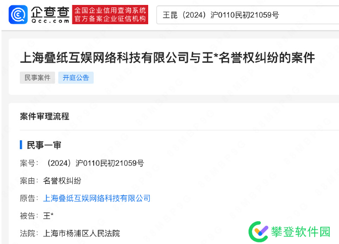 据企查查上海叠纸互娱网络科技有限公司新增一条开庭公告信息,被告为王昆(派克特本名)。预计2025年1月14日下午14:00开庭。