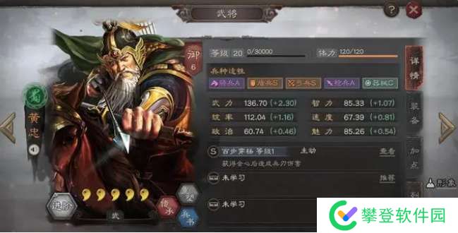 3、黄忠自己的战法输出是不够高的,所以这里需要选择破阵+所向,这个战法输出伤害极高,也是目前版本最强的爆发战法,其次就是万箭齐发这个战法。