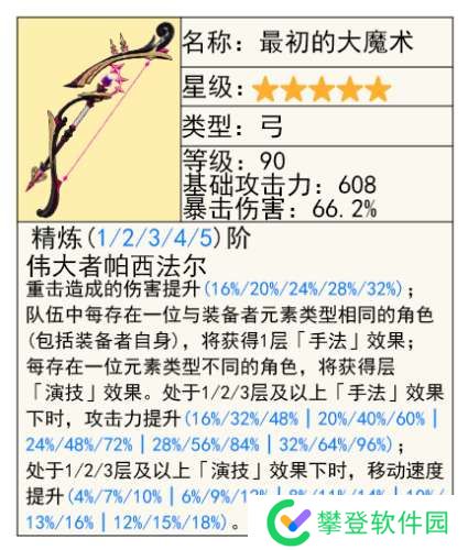 专门重击的弓,瞄准射击类的角色都可以使用,并且队伍中的同元素可提升攻击力,不同元素可提升移速,根据情况,可以组2、3同元素的方式吃满攻击力加成,移速方面倒不怎么推荐组3个不同元素的吃满移速加成,因为对伤害没帮助,但多多少少是可以提升操作手感的。