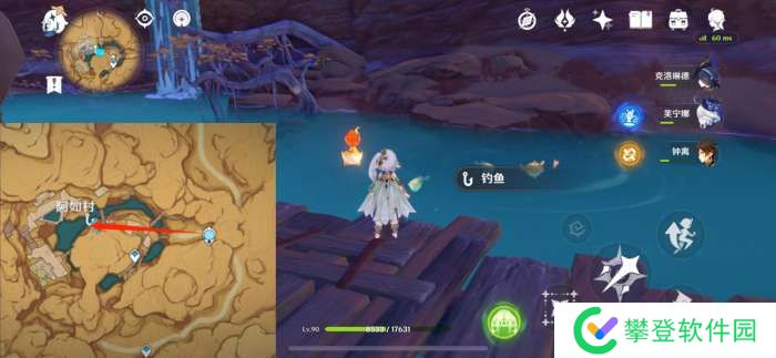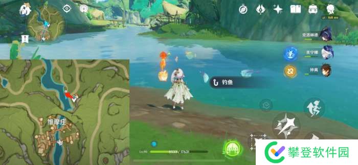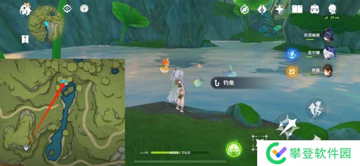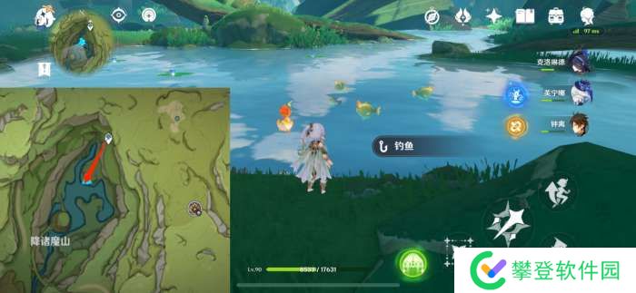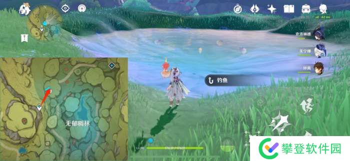 钓鱼点在溪流边,旁边有丘丘人、冰深渊法师