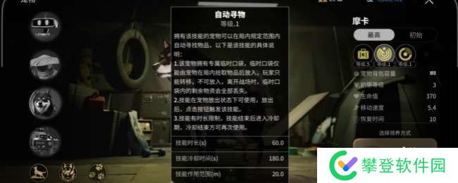 拥有该技能的宠物可以在局内规定范围内自动寻找物品,该宠物拥有专属临时口袋,临时口袋仅能由宠物在局内拾取物品后放入,玩家只能转移,不可放入,离开战场时,临时口袋内的剩余物资会全部丢失。