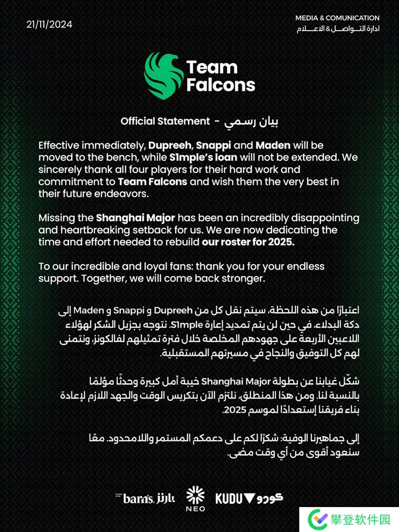 这则声明意味着Falcons新一轮阵容重建的开始,他们在去年年底下放四名选手,围绕ENCE核心选手Snappi、