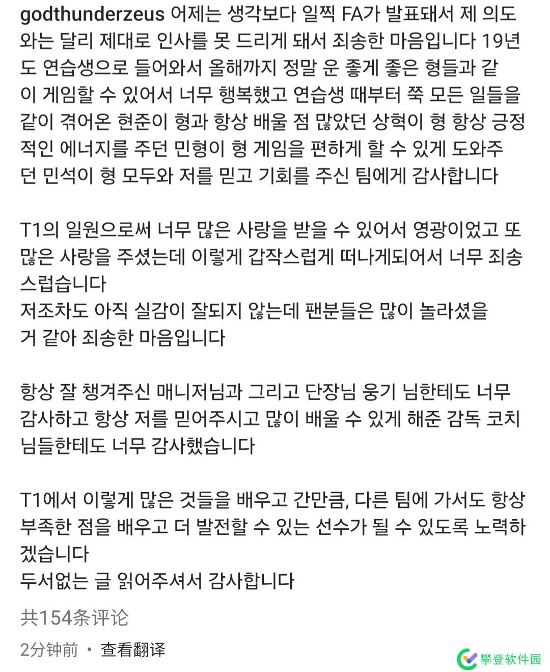 非常感谢一直照顾我的经纪人和团长WOONG GI 也感谢一直相信我 让我学到很多东西的教练们,因为在T1学到了很多东西 所以去其他队也会努力学习不足之处 成为能够进步的选手。感谢你阅读这篇没有条理的文章。