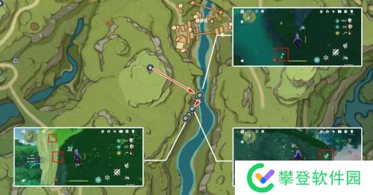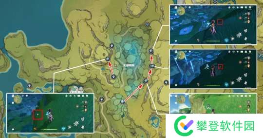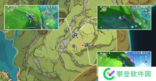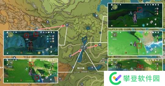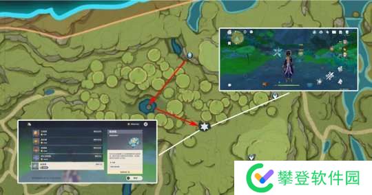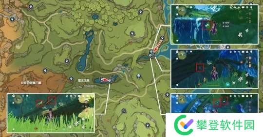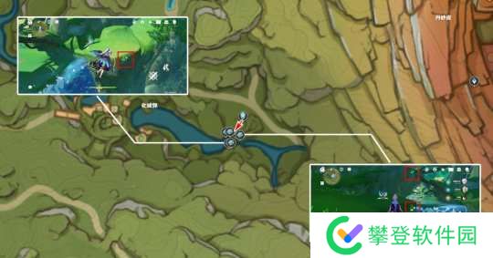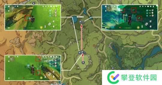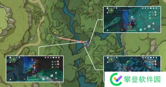 ◆左中采集点东山顶传送点出发,采集点位于神龛上方的树枝上;路线二第一处位于瀑布所在山崖两侧,第二处位于山洞内(洞口未解锁就从东侧山洞内锚点出发)。