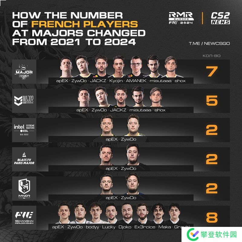 在2021年的斯德哥尔摩Major上,共计有7名法国选手参赛。之后这一数字不断下降,连续三届Major都只有apEX和ZywOo两名法国选手。而这一次bodyy(效力于