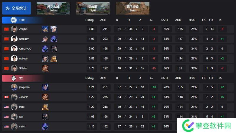 图一莲华古城,上半场EDG率先拿下手枪局和ECO,随后G2收下福利局并拿下第一个长枪分,不过EDG再迅速拿下两分,G2迅速调整策略,直接一波5:0反超并拉开了比分,半场G2拿到了7分。下半场G2拿下手枪局和ECO之后,EDG拿下一个福利局,随后G2一波3:0拿到赛点,最终比分定格在G2 13:8 EDG。