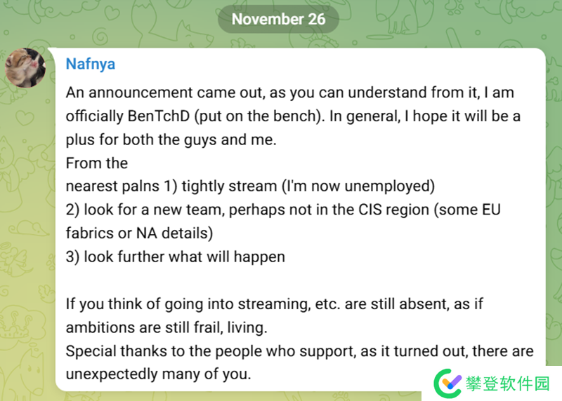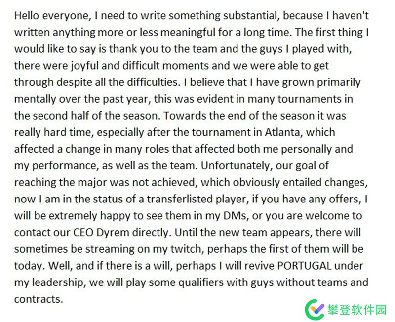不幸的是,我们未能实现进入Major的目标,这显然需要做出改变,现在我的身份是一名转会名单上的选手。如果您有任何offer,我将非常乐意在私信中查看,或者欢迎您直接联系我们的首席执行官Dyrem。在加盟新队伍之前,我会偶尔进行直播,也许今天会是第一次。另外如果有意愿的话,也许我会作为指挥重振葡萄牙CS,我们会和没有队伍和合同束缚的选手打一些预选赛。”