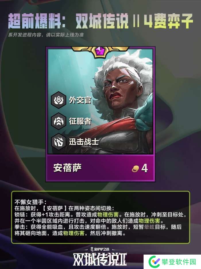 金铲铲之战双城之战24费棋子有哪些?金铲铲之战即将在11月22日开启双城之战2新赛季,在这个赛季将上线不少的新棋子,那么大家知道都有哪些4费棋子吗?这些棋子的技能是什么呢?下面快跟随小编一起来看看金铲铲之战双城之战24费棋子技能吧。