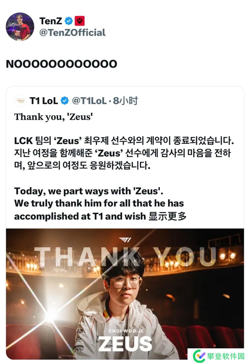 TenZ因T1宣布Zeus离队的消息在社交媒体上发文感叹。近日T1官方宣布与LCK上单选手Zeus的合同到期,正式结束合作。
