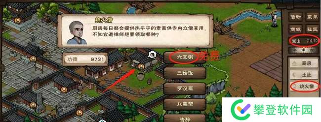 ①、此外少林玩家每天可以在厨房的烧火僧(14,10)领素斋,六耳粥可以免费领,白嫖30点体力,每天1次,其他门派不行。