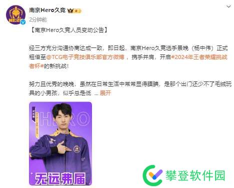 经三方充分沟通协商达成一致,即日起,南京Hero久竞选手景晚(杨中伟)正式租借至TCG电子竞技俱乐部官方微博 ,携手并肩,开启2024年王者荣耀挑战者杯的新挑战!