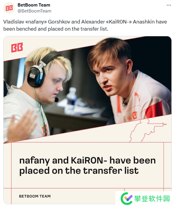 nafany与KaiR0N-二人于2023年7月正式加盟BB战队,但在效力期间,该队伍在各项赛事中表现平平,鲜有成绩。在最近的上海Major欧洲RMR A组比赛中,他们也未能逆天改命,最终无缘上海Major舞台。