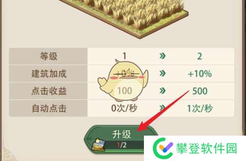 3、之后会触发功能弹框,点击升级,即可消耗一定数量的农田改建图进行升级。