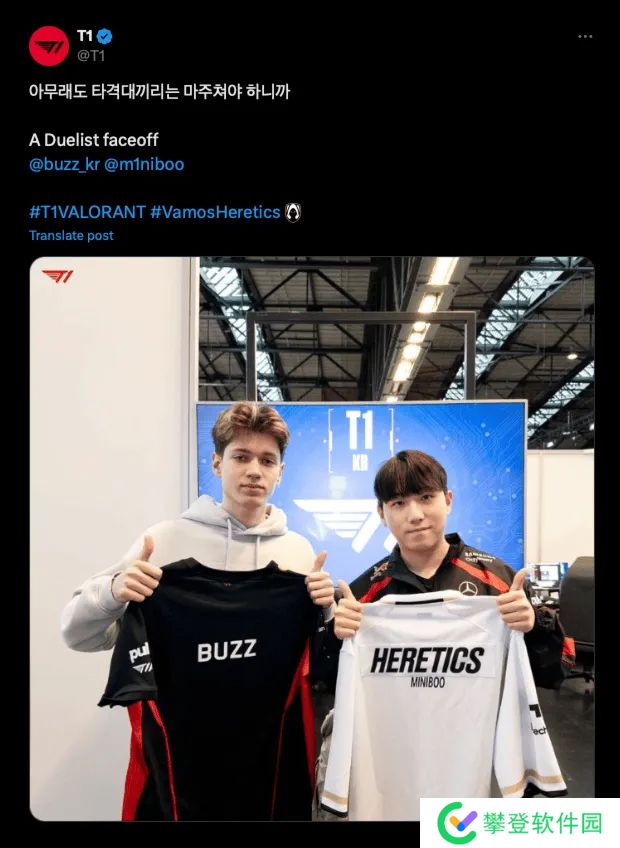 T1官方晒队内BuZz选手与TH战队MiniBoo选手交换队服。